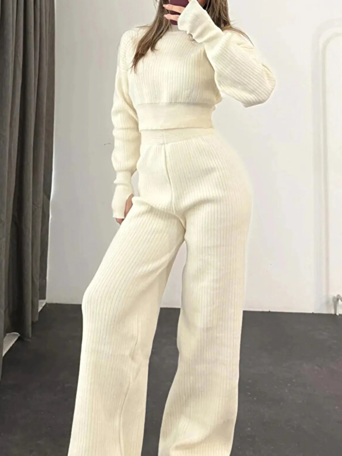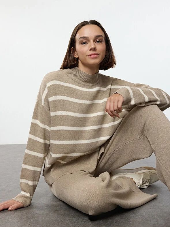 Compleu Tricotat cu Pantalon Minka Bej cu Dungi Albe