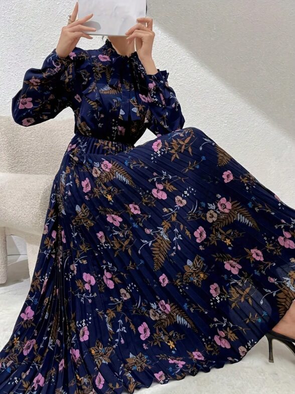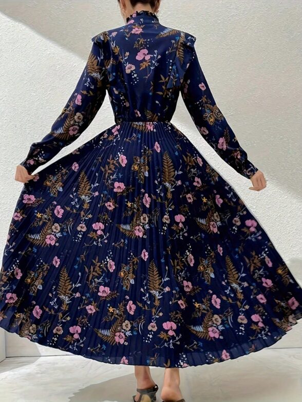 Rochie Lunga Eliss Bleumarin cu Print Floral Roz