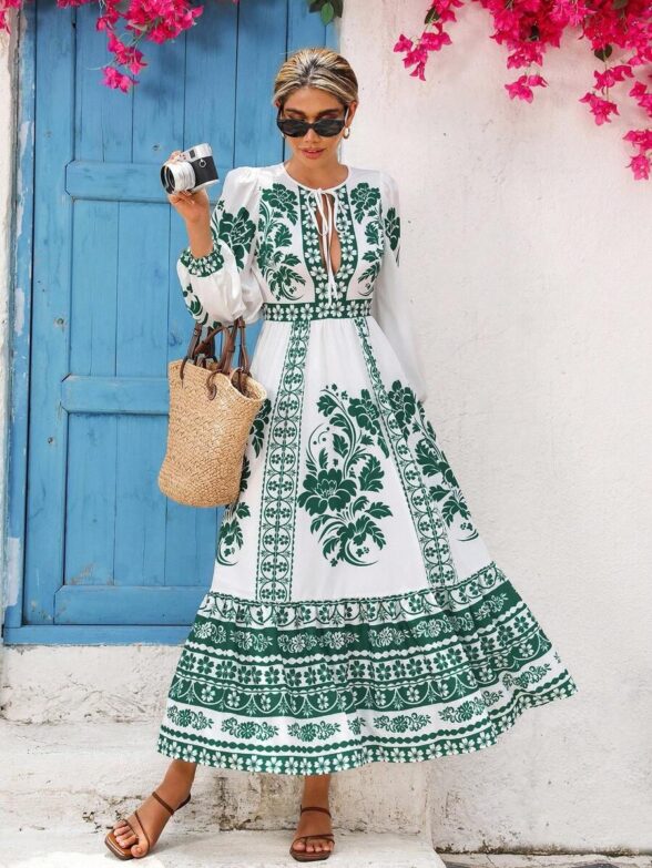 Rochie Lunga Emina Alba cu Print Verde