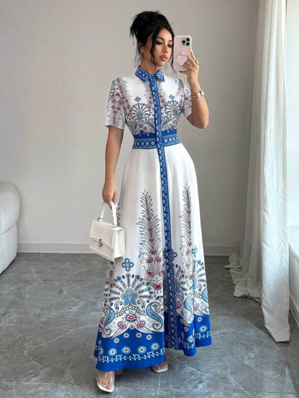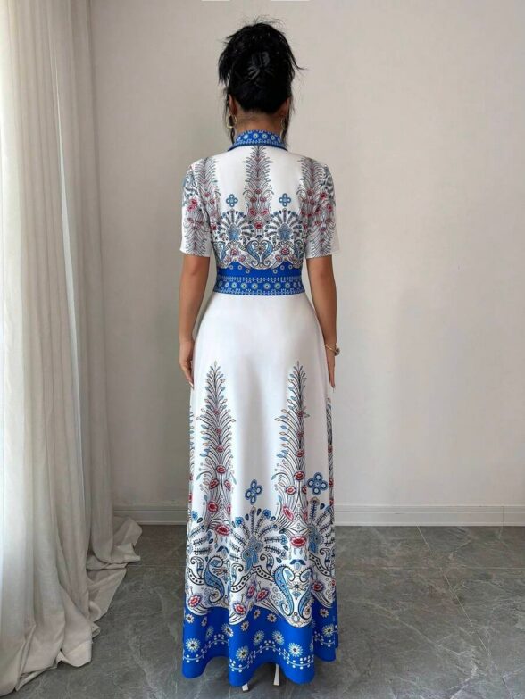 Rochie Lunga Ezra Alba cu Print Albastru