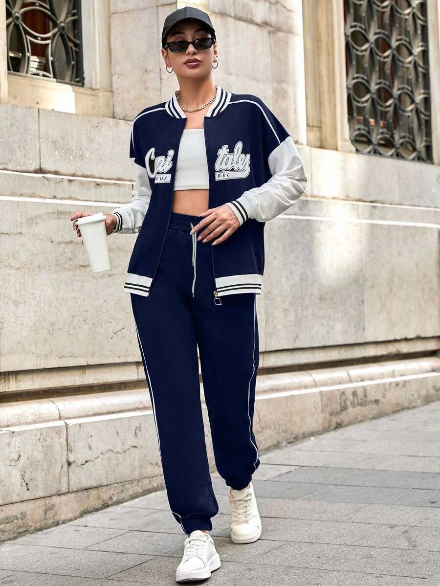 Trening Dama Sandra Bleumarin cu Maneci Albe din Bumbac