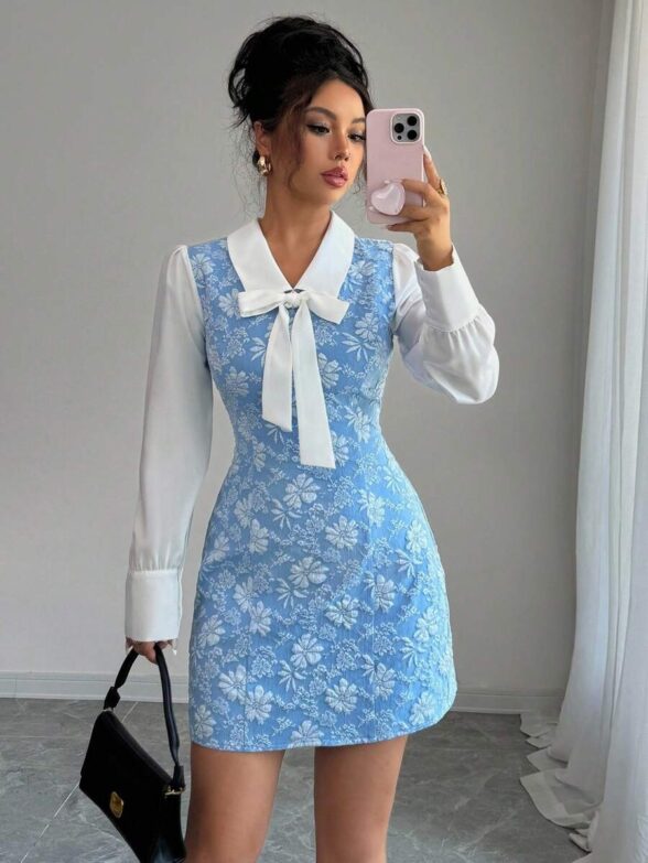 Rochie Scurta Eleanor Bleu cu Flori in Relief si Maneci Albe