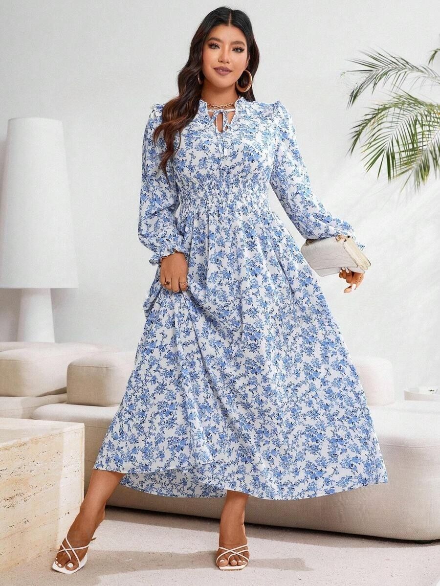 Rochie Lunga Felly Alba cu Print Floral Albastru- Marimi Mari