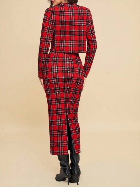 Compleu cu Fusta Midi Jannik Rosu cu Print Geometric Negru si Alb