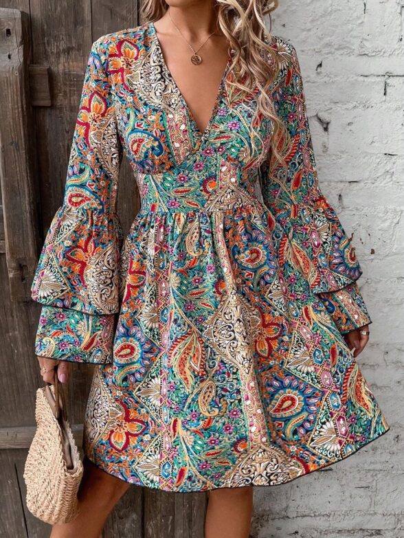 Rochie Midi Ronna Bej cu Print Geometric Negru si Alb