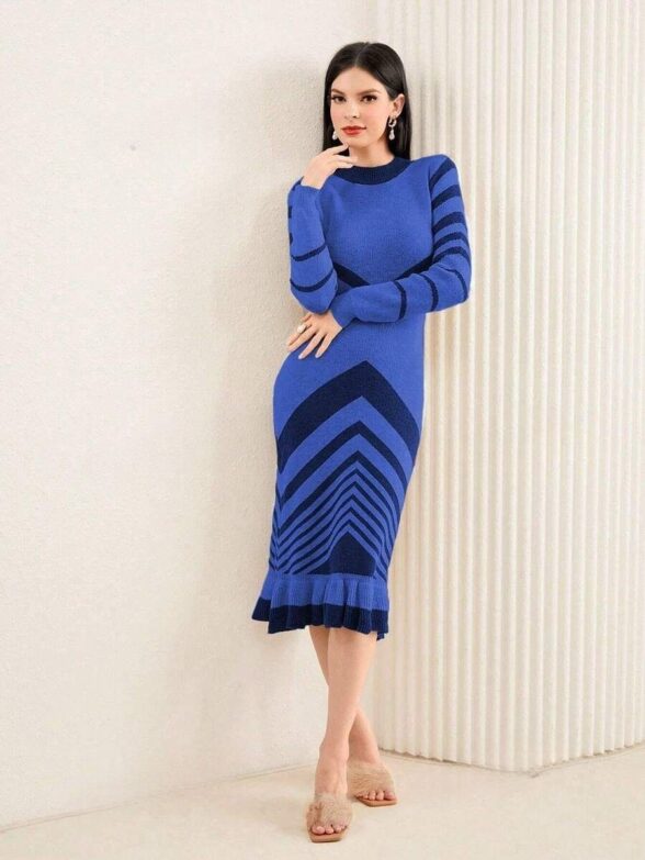 Rochie Midi Tricotata Kavya Albastra cu Dungi Negre