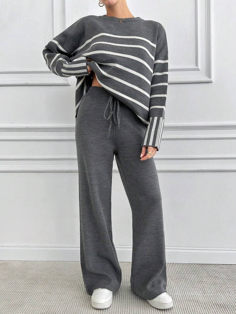 Compleu Tricotat cu Pantalon Lamia Gri cu Dungi Albe
