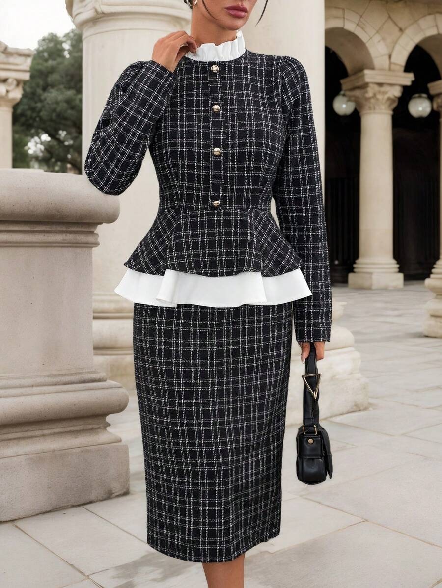 Compleu cu Fusta Midi Mildred Negru cu Print Geometric Alb