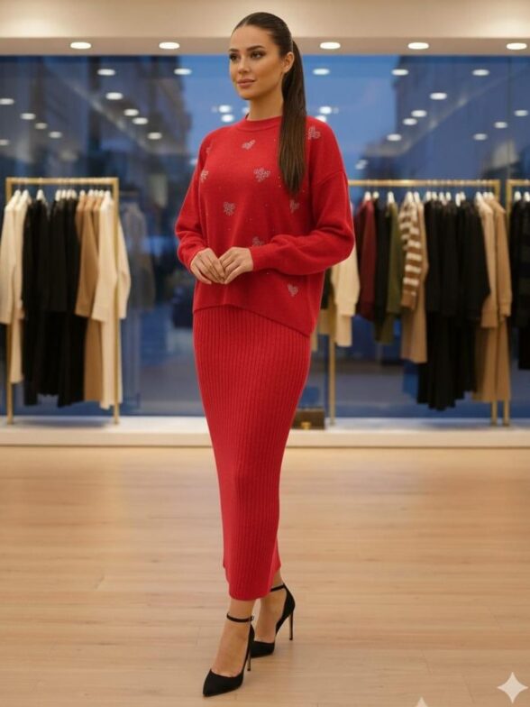 Compleu Tricotat format din Rochie fara Maneci si Bluza Luzmila Rosu