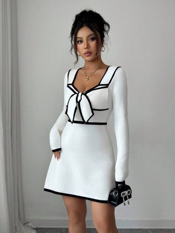Rochie Scurta Arabela Alba Cu Imprimeu Geometric Negru Si Funda