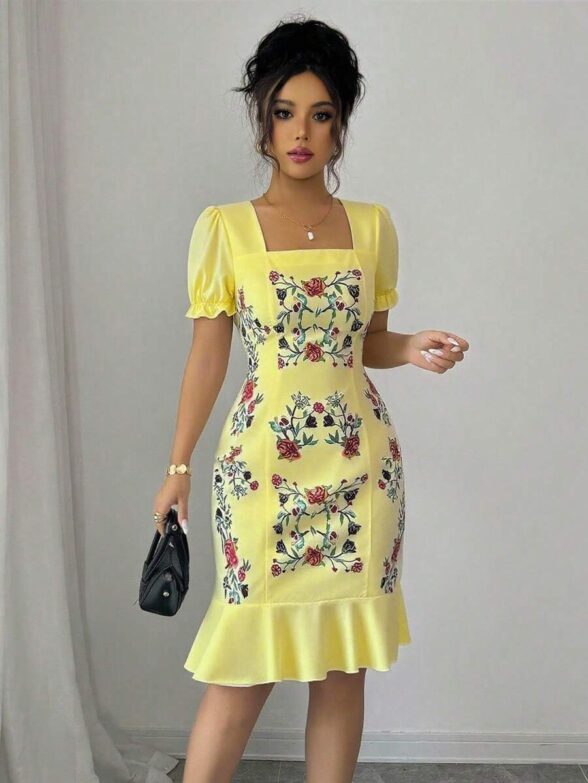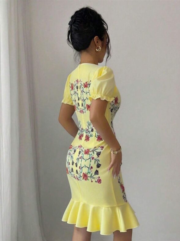 Rochie Scurta Davis Galbena cu Print Floral Rosu