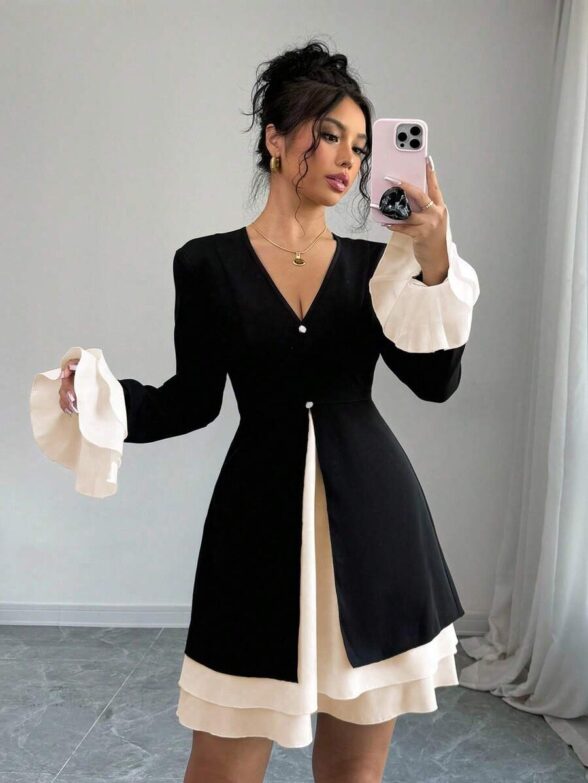 Rochie Scurta Ruana Neagra cu Mansete Crem