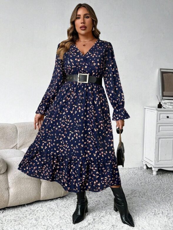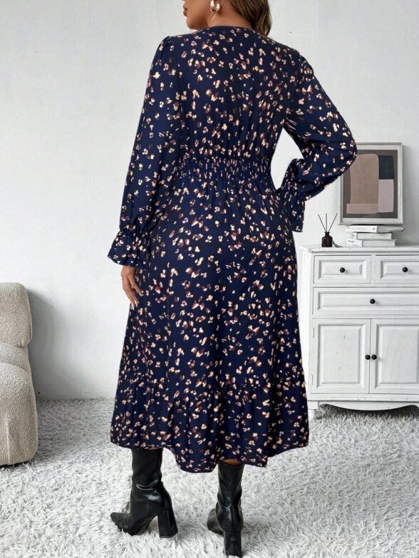 Rochie Lunga Marija Bleumarin cu Print Multicolor – Marimi Mari