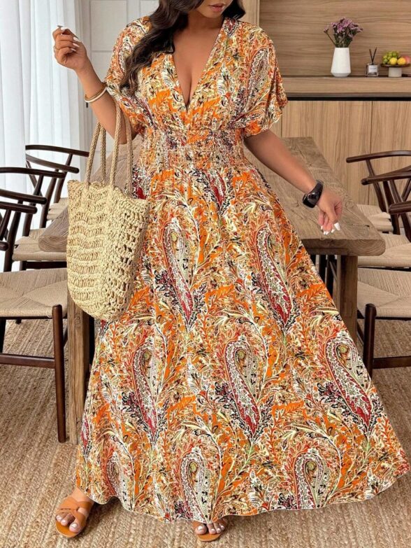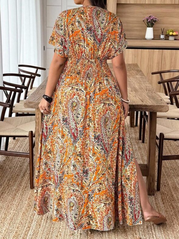 Rochie Lunga Abbey Khaki cu Print Floral Portocaliu – Marimi Mari
