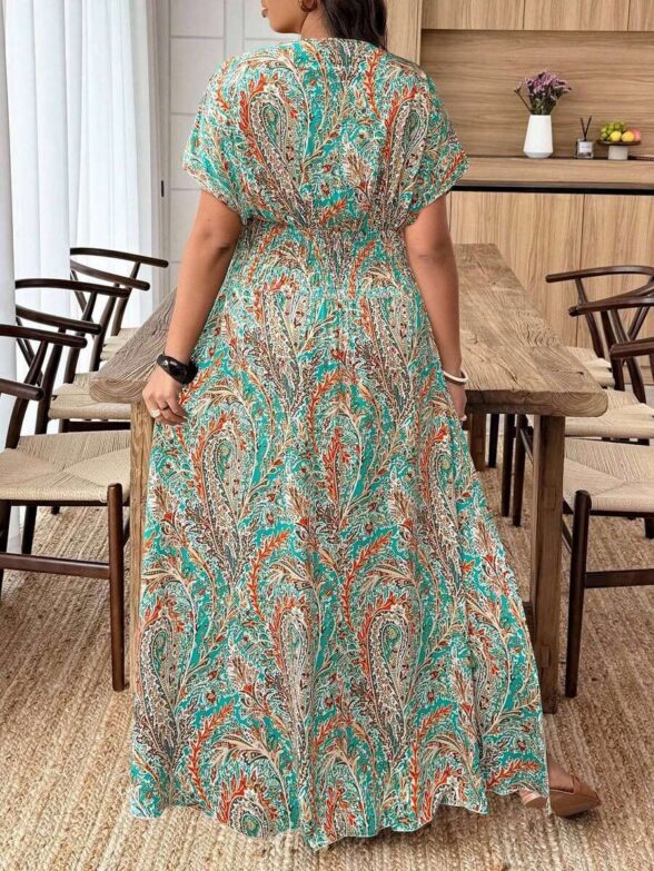 Rochie Lunga Cassie Turcoaz cu Print Floral Roz – Marimi Mari