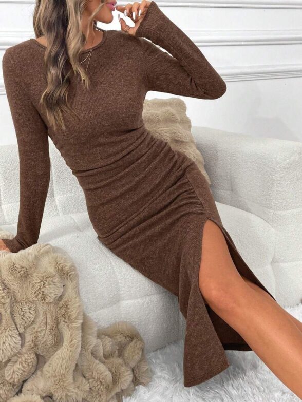 Compleu Tricotat format din Rochie fara Maneci si Bluza Amorina Maro