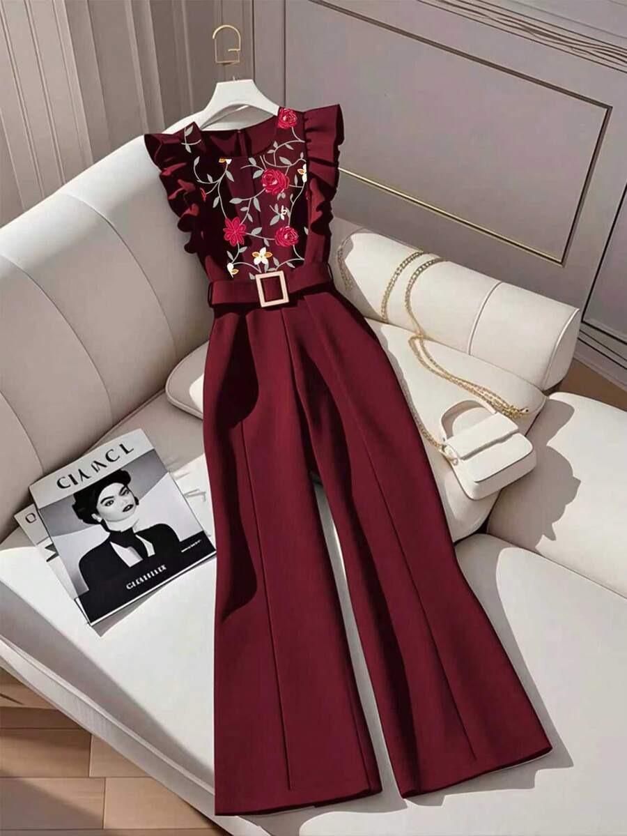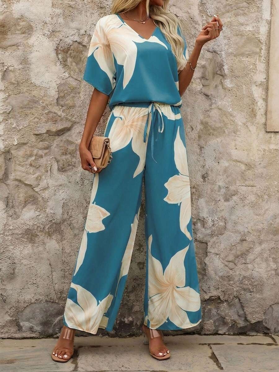 Compleu Bertha Albastru cu Print Floral Crem format din Top si Pantalon