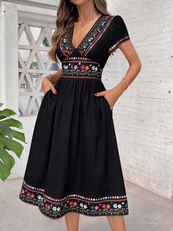 Rochie Midi Polona Neagra cu Print Floral Multicolor