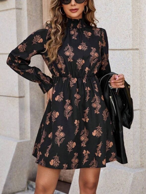 Rochie Scurta Sorana Neagra cu Print Floral Maro