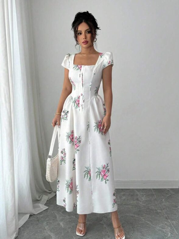 Rochie Lunga Sarah Crem cu Print Floral Roz