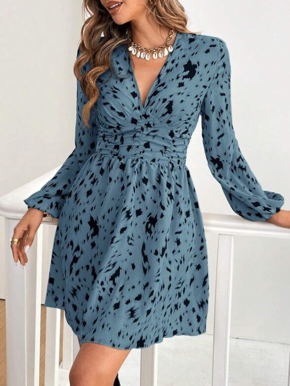 Rochie Scurta Lara Albastra cu Print Negru