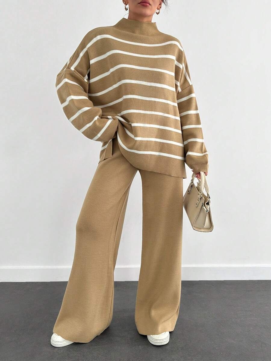 Compleu Tricotat cu Pantalon Iren Bej cu Dungi Albe