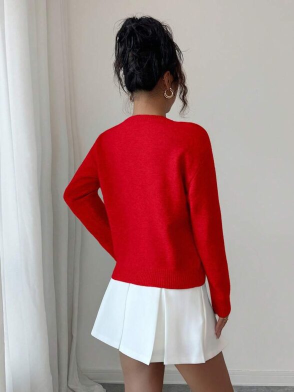 Pulover Tricotat Rikka Rosu cu Flori Albe Aplicate