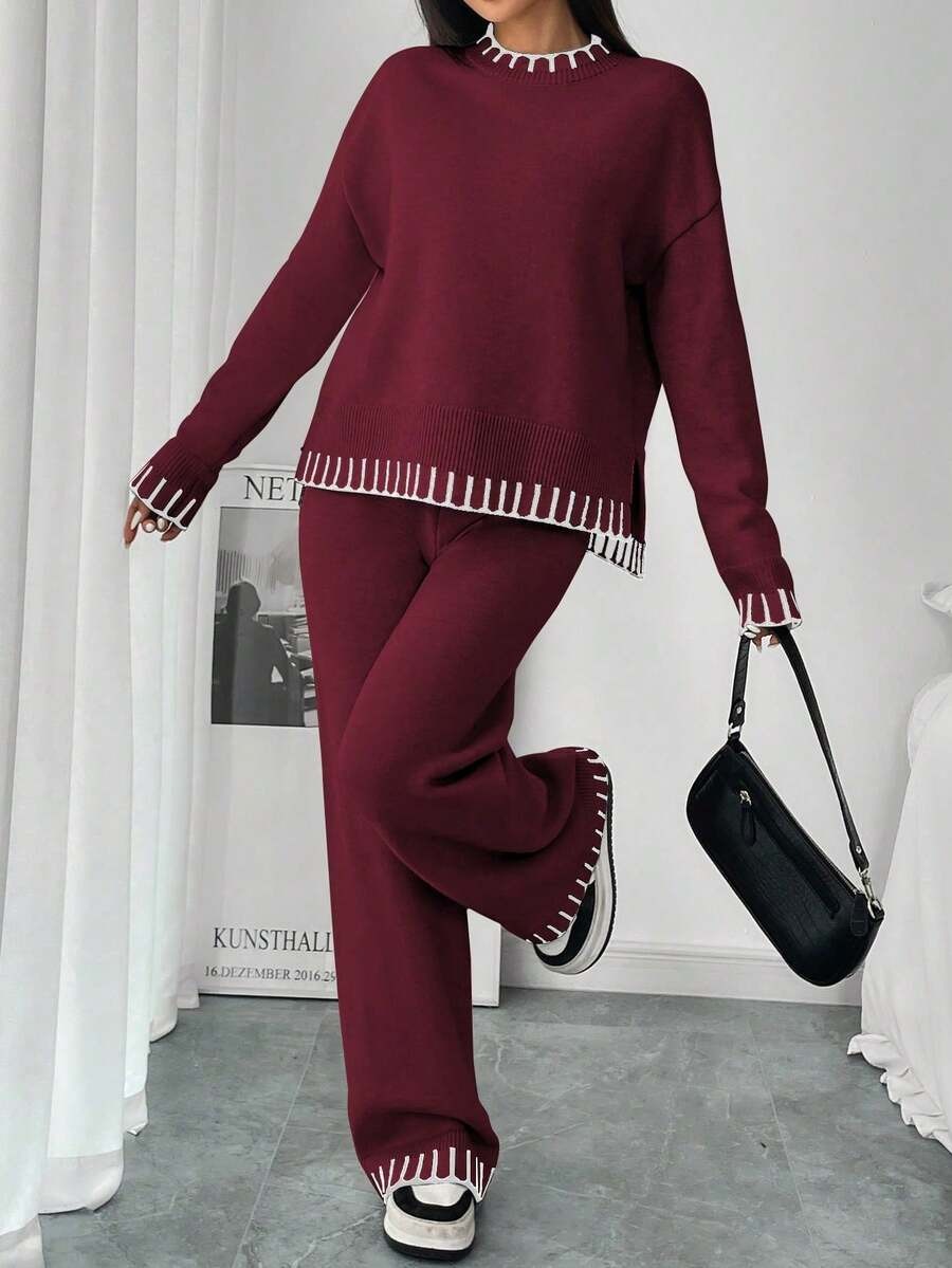 Compleu Tricotat cu Pantalon Eniko Gri cu Dungi Negre - Marimi Mari