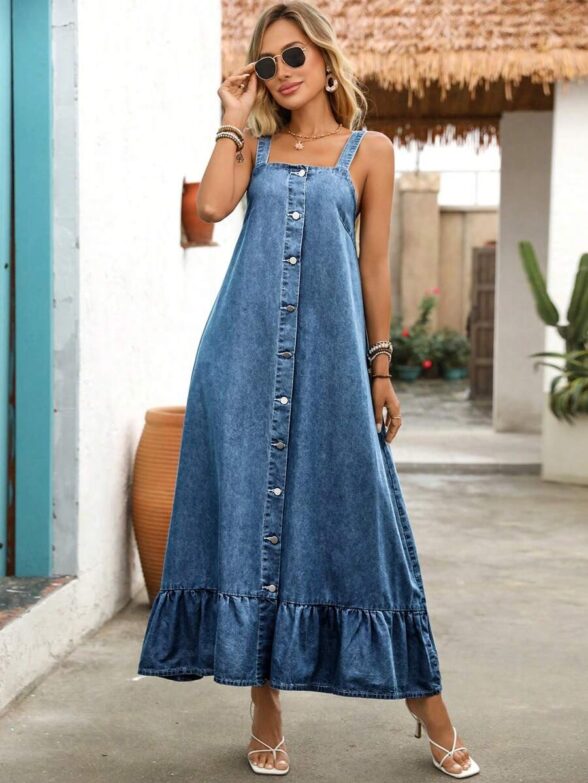 Rochie Lunga Mairin Albastra Cu Nasturi