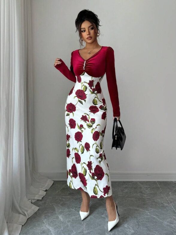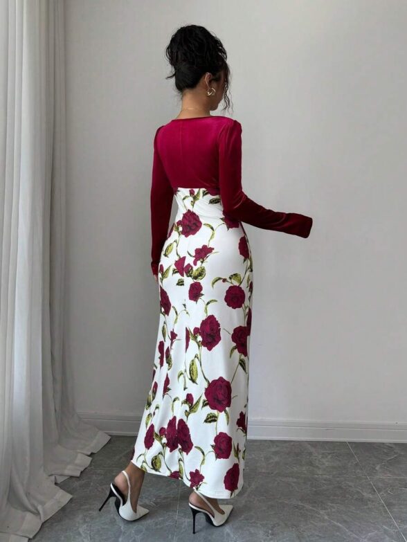 Rochie Lunga Adnana Neagra cu Print Floral Rosu