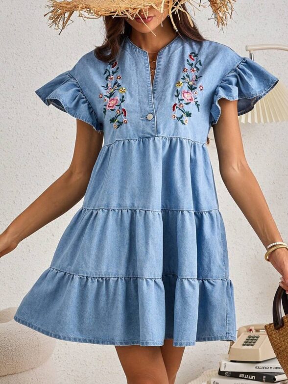 Rochie Scurta Eleanor Bleu cu Flori in Relief si Maneci Albe