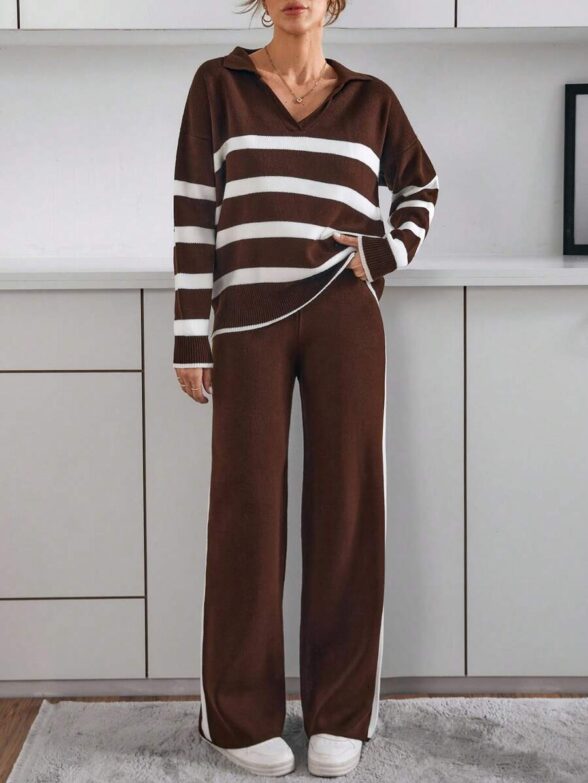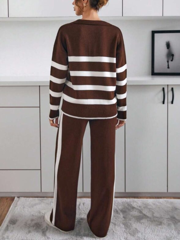 Compleu Tricotat cu Pantalon Serda Maro cu Dungi Albe