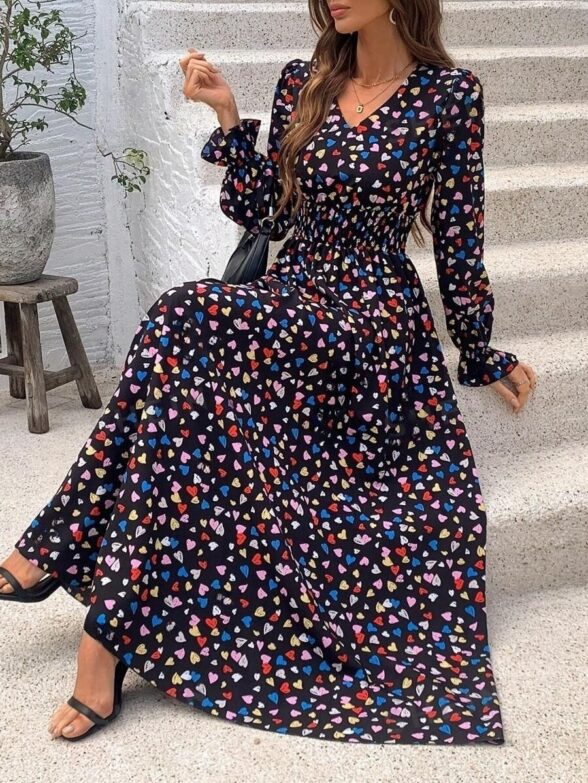 Rochie Lunga Serinesa Neagra cu Inimioare Multicolore