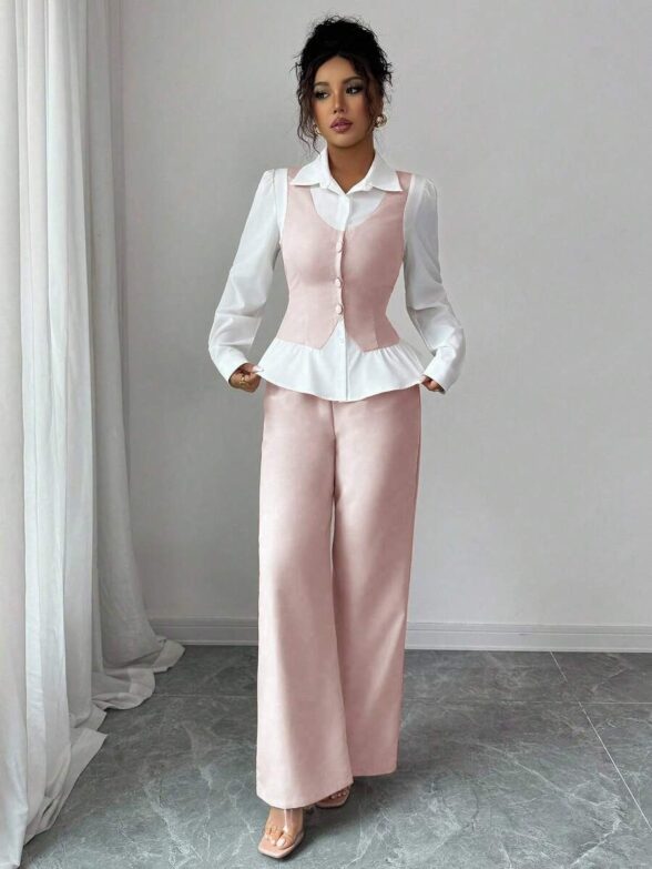 Compleu cu Pantalon Siska Roz cu Maneci Albe