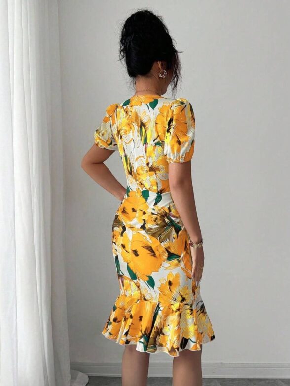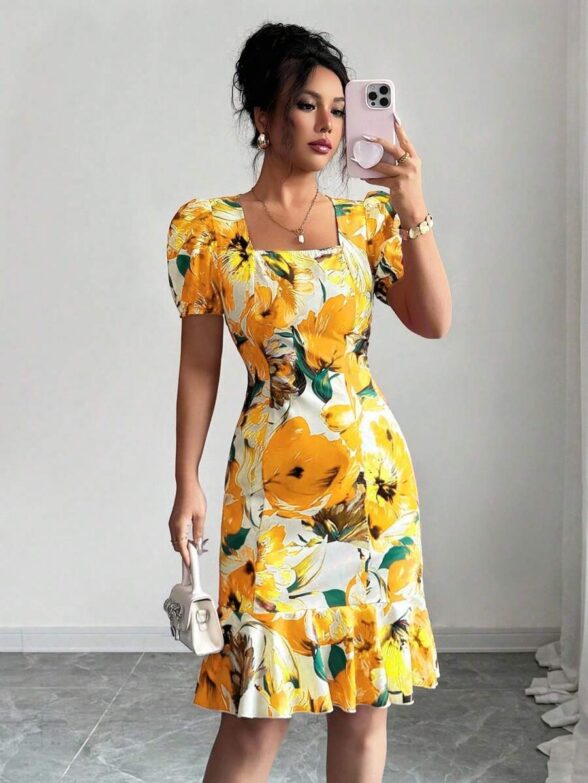 Rochie Scurta Tania Alba cu Print Floral Galben
