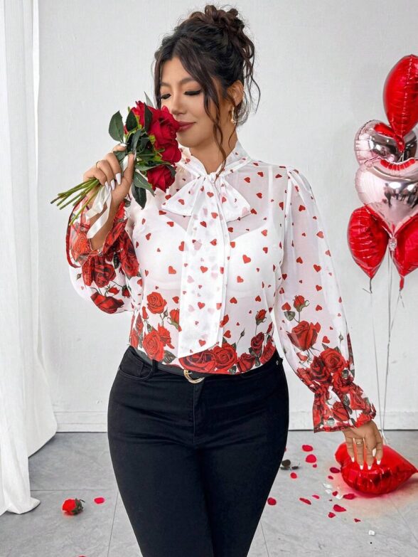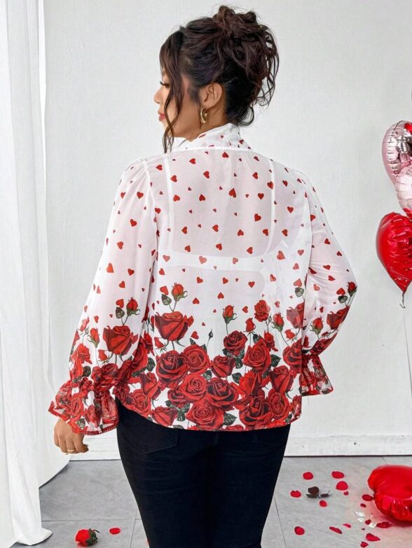 Camasa Dama Layla Alba cu Inimioare Rosii si Trandafiri – Marimi Mari