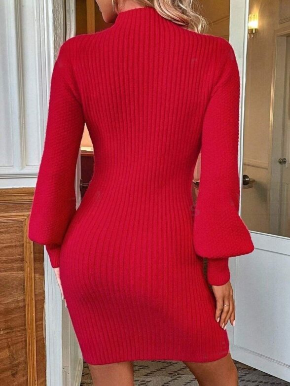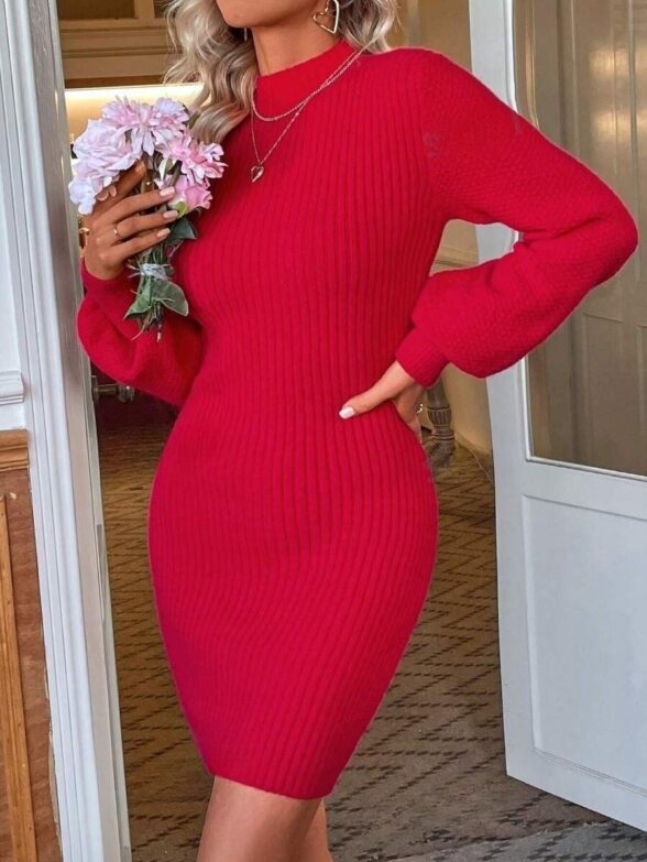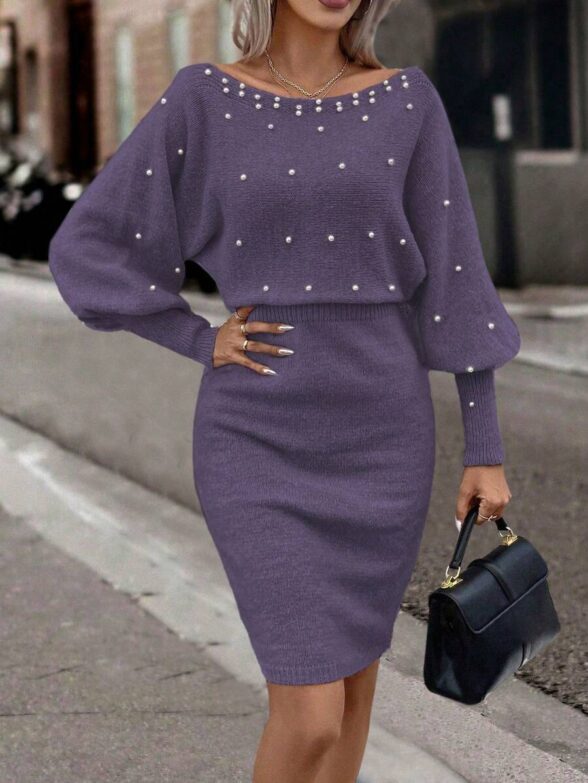 Rochie Midi Tricotata Monalise Maro cu Maneci Bufante si Perle