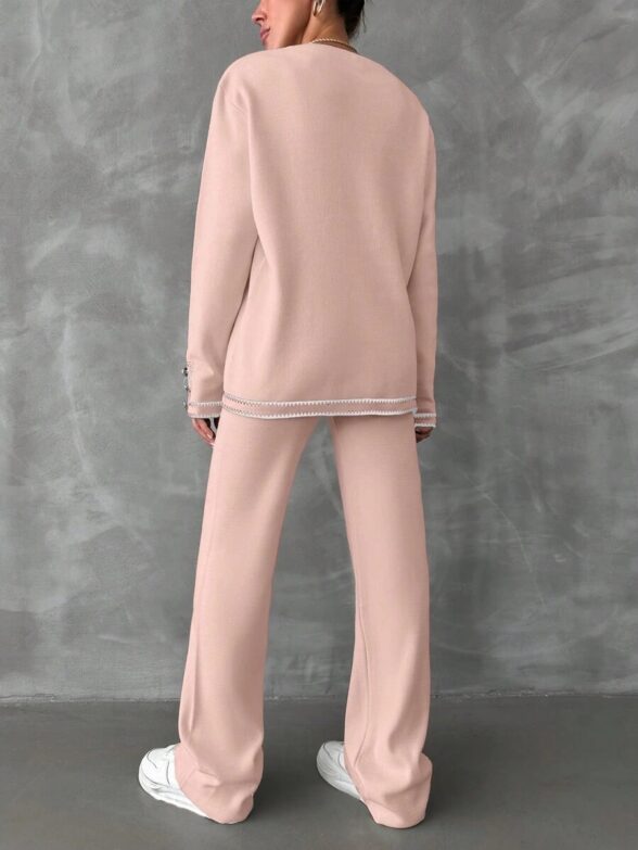 Compleu Tricotat cu Pantalon Cosima Roz cu Print Geometric