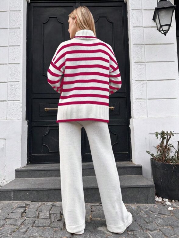 Compleu Tricotat cu Pantalon Martine Alb cu Dungi Roz