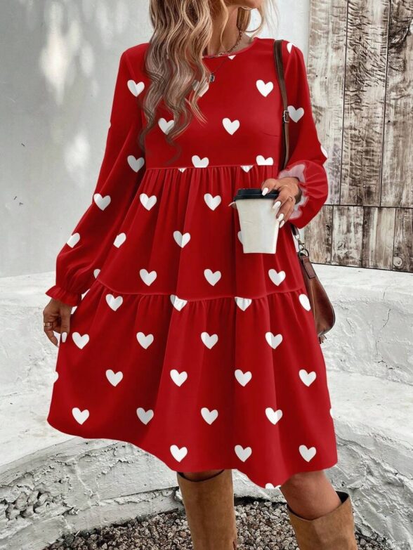 Rochie Scurta Beatrice Rosie cu Inimi Albe – Marimi Mari