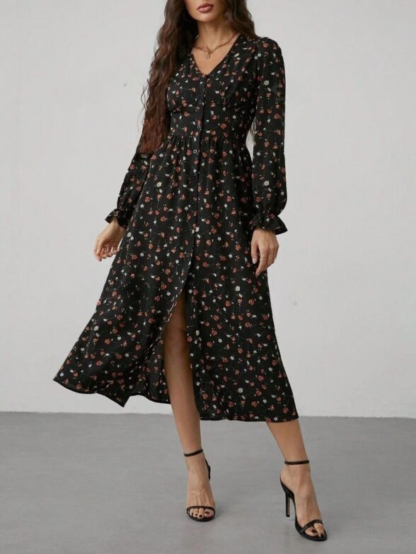 Rochie Lunga Palmer Bleumarin cu Print Floral Maro