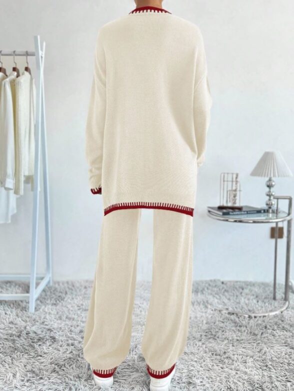Compleu Tricotat cu Pantalon Suzan Rosu cu Dungi Negre