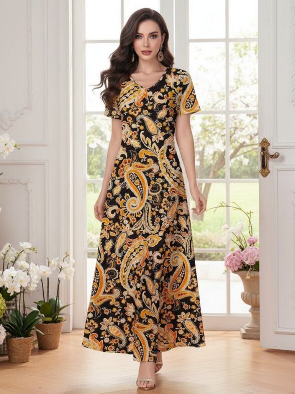 Rochie Lunga Asra Neagra cu Print Floral Maro