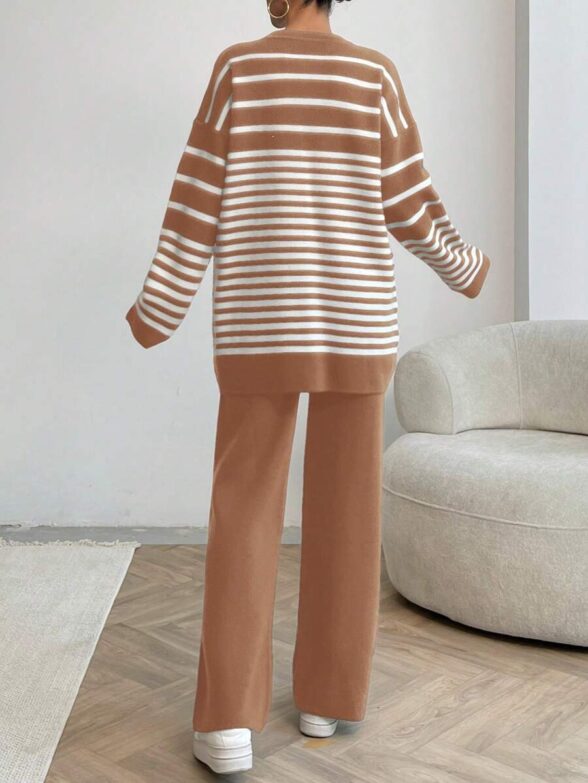 Compleu Tricotat cu Pantalon Donda Gri cu Dungi Albe