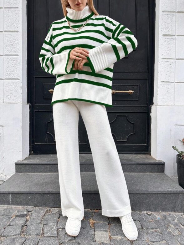 Compleu Tricotat cu Pantalon Coriss Bleumarin cu Dungi Verzi
