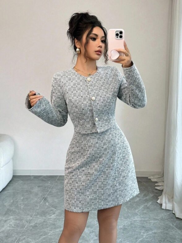 Rochie Midi Tricotata Monalise Gri cu Maneci Bufante si Perle