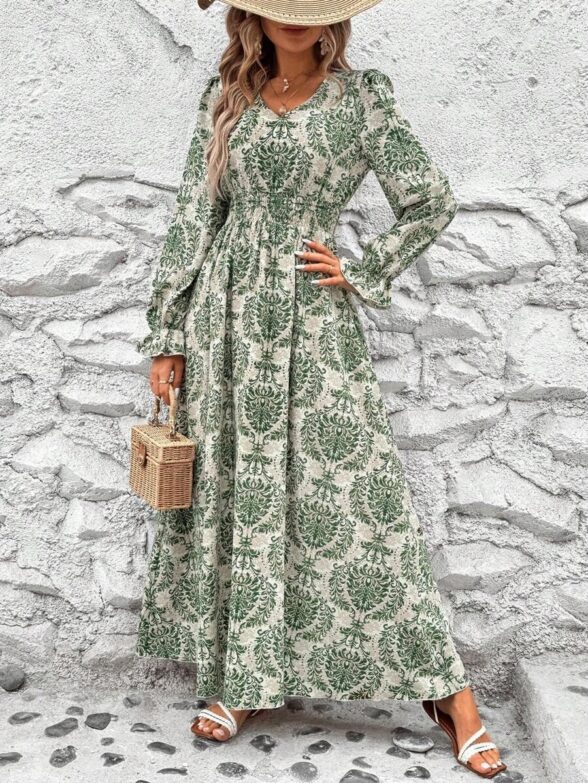 Rochie Lunga Tosia Bej cu Print Verde