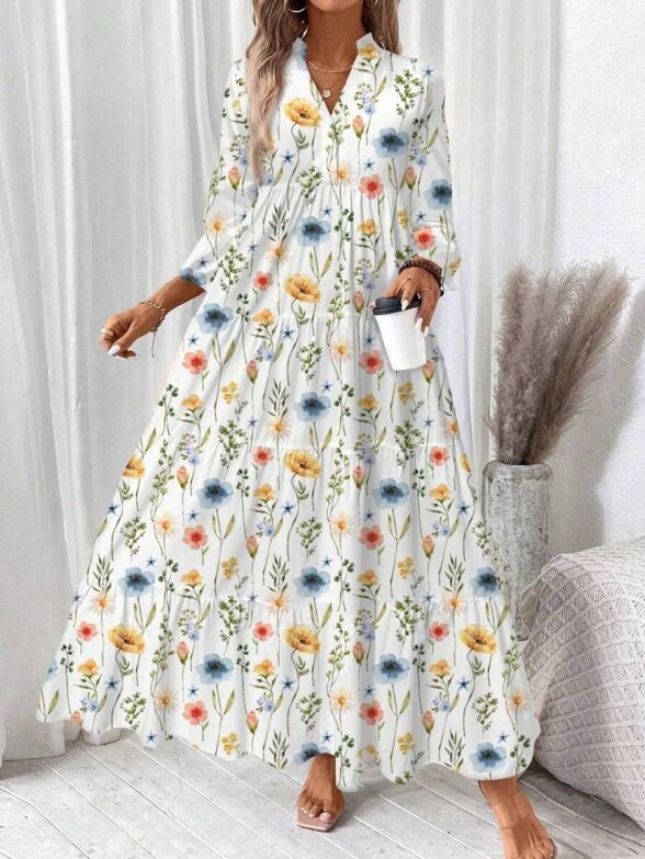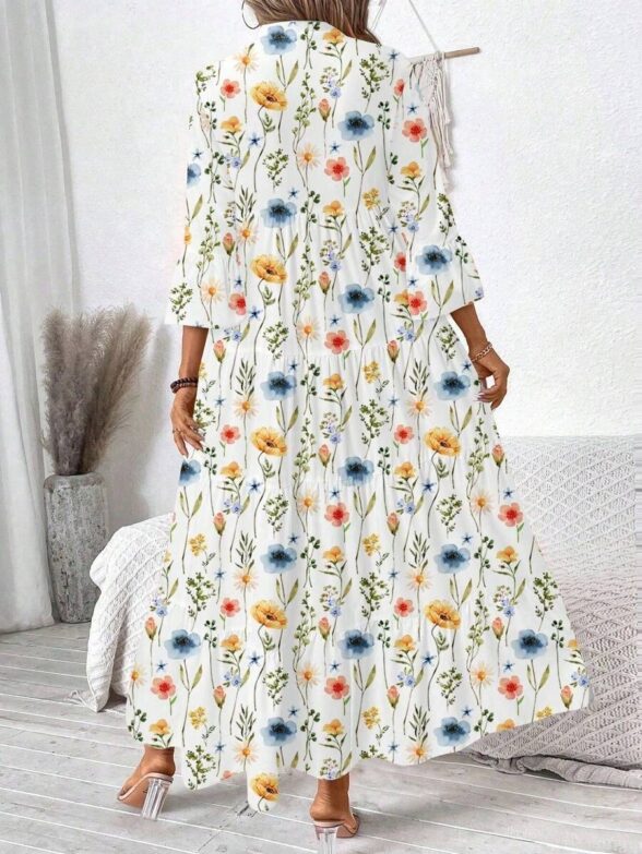 Rochie Lunga Melania Alba cu Print Floral Multicolor