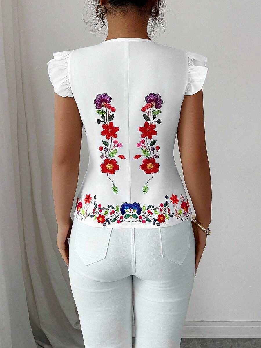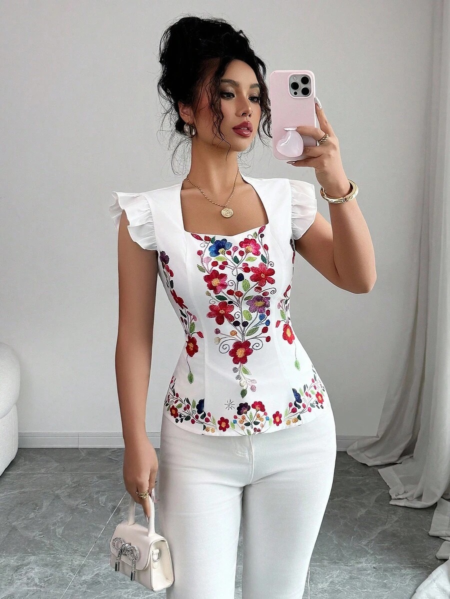 Bluza Dama Esra Alba cu Print Floral Rosu