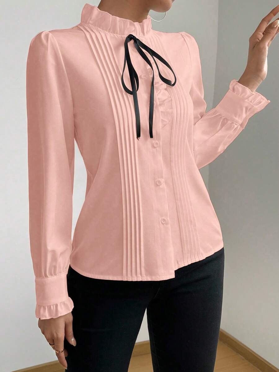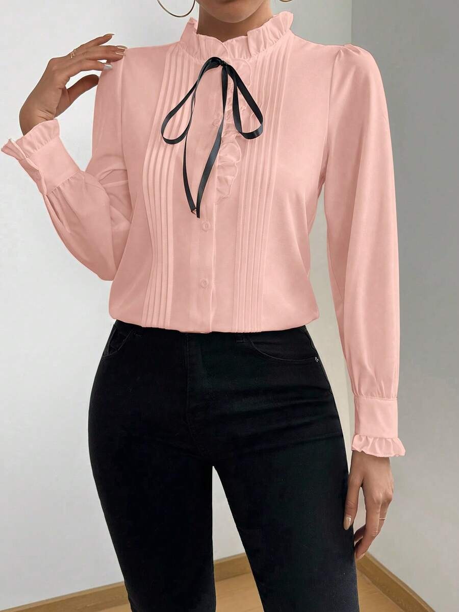 Cămașă Roz Elegantă cu Volănașe și Panglică – „Fiona”